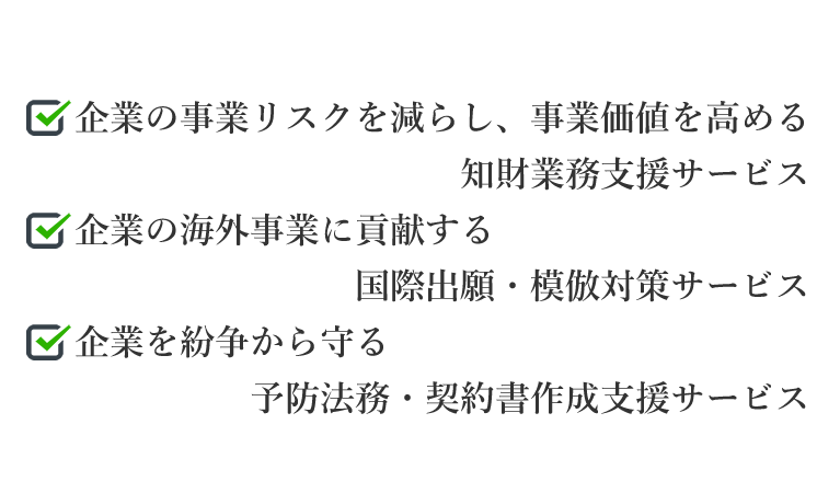 弊所は、「弁理士法人」と「弁護士法人」により構成され、知的財産・法務について“ワンストップ”で、質の高いサービスを提供できる点を“強み”としております。